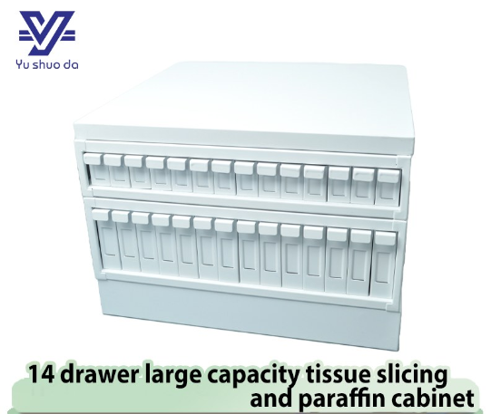 Storage cabinet used for storing paraffin blocks and glass slides, Each unit has 14 drawers, Each unit can bestacked and the drawers are easy to pull out,The reserved groove in front of the drawer slot can ac.commodate the long l.D label that comes with each unit.